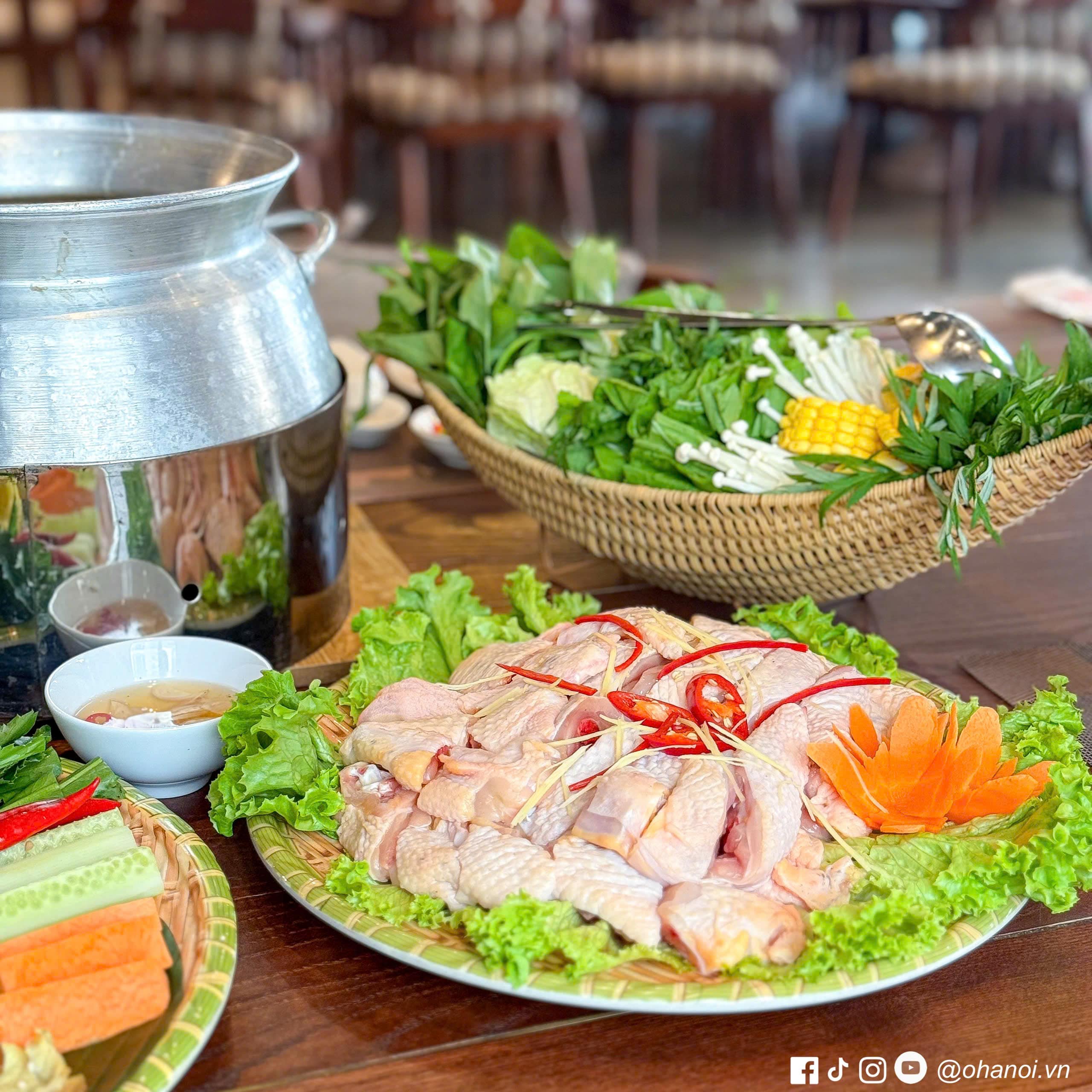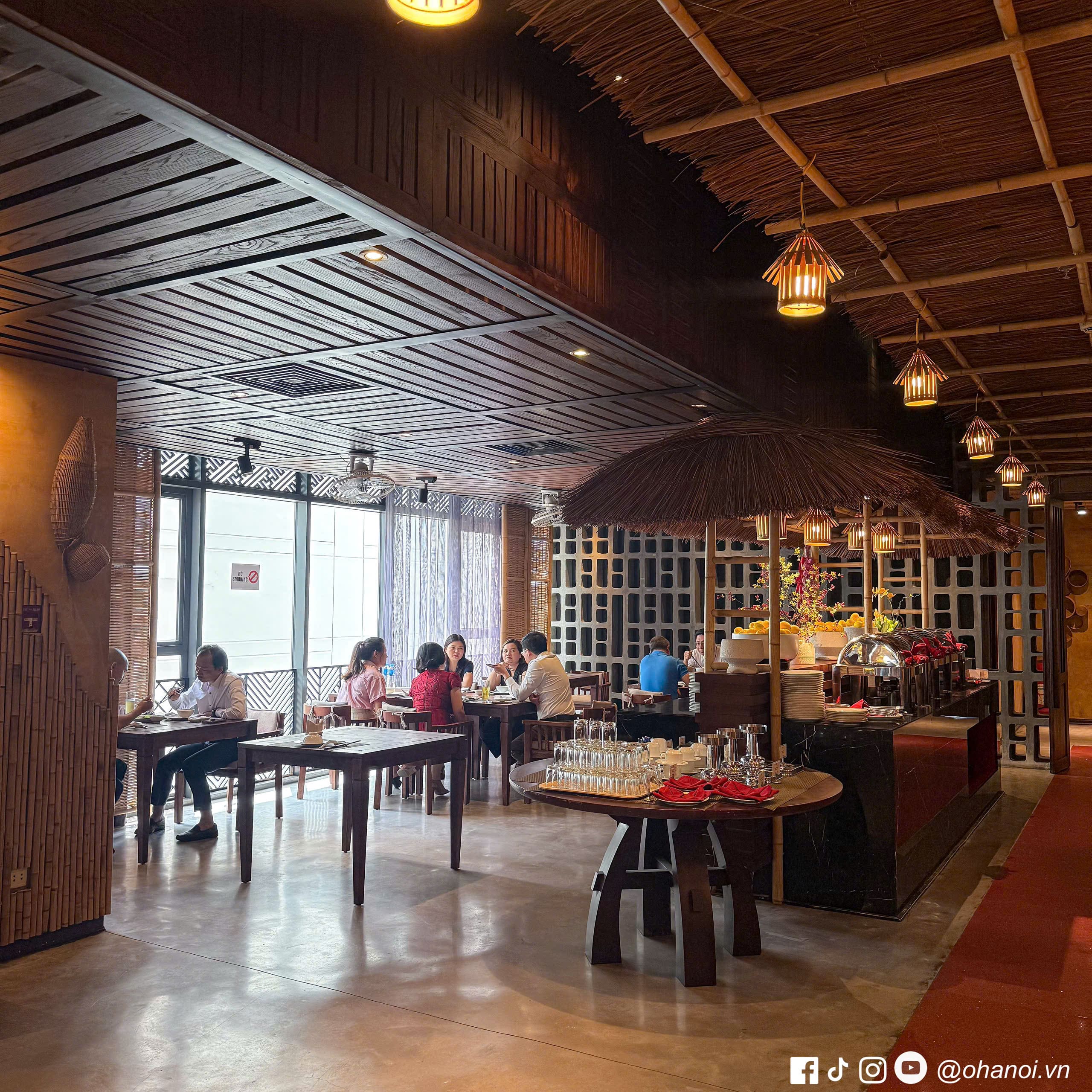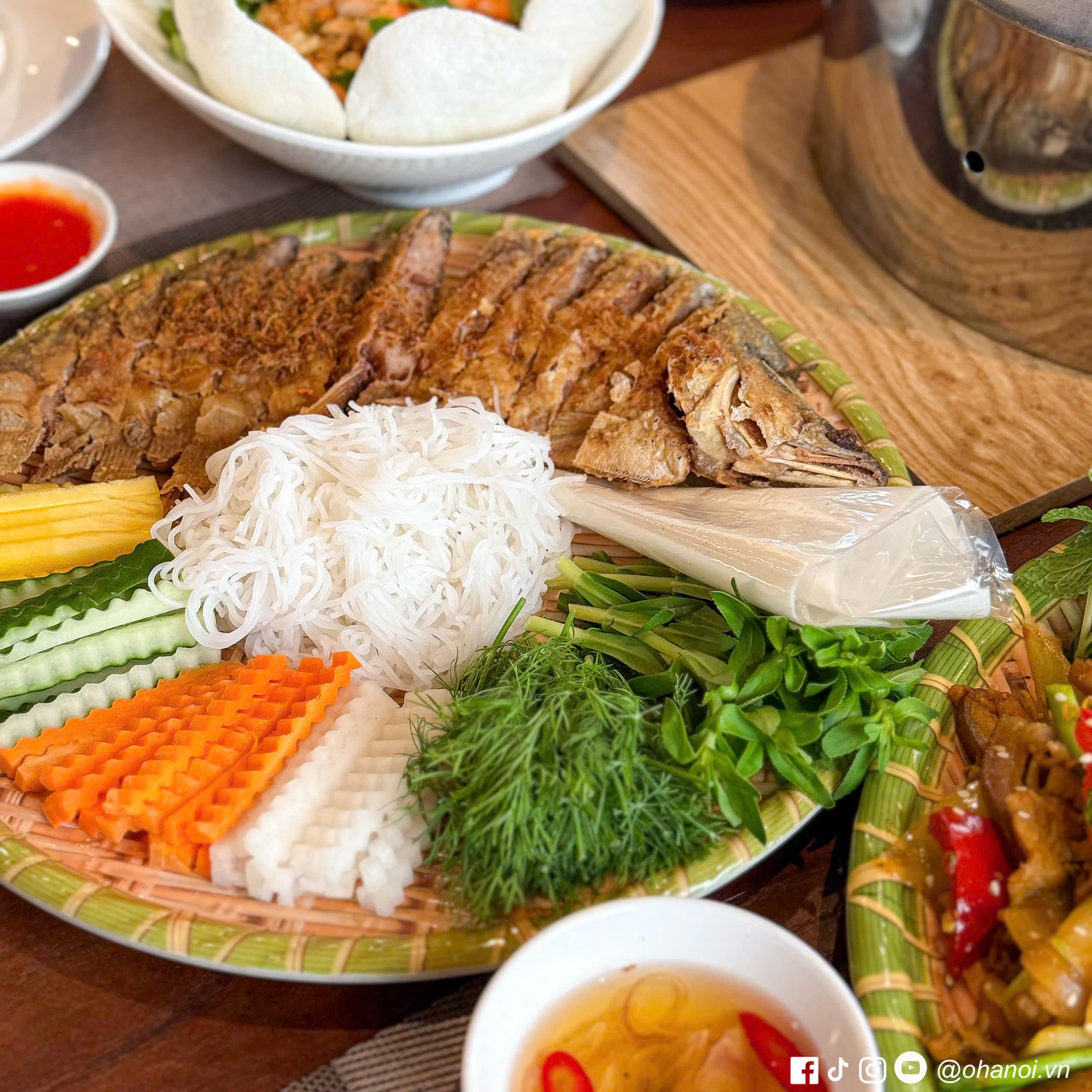 Mình còn ấn tượng với chả cốm gói cánh sen – từng miếng chả vàng ươm nằm trong cánh sen hồng, cắm thêm lá cờ nhỏ xinh, vừa ngon vừa trang trọng. Lẩu gà ri rượu nếp thì thơm lừng, nước dùng ngọt từ xương, xen chút chua dịu của bỗng, ăn kèm rau nấm, miến – mẹ mình khen gà siêu ngon. Mẹt cá thác lác Hoàng Kim cũng đáng thử, nhìn nguyên con cá mà bên trong lại là chả cá, ăn vui miệng lắm.