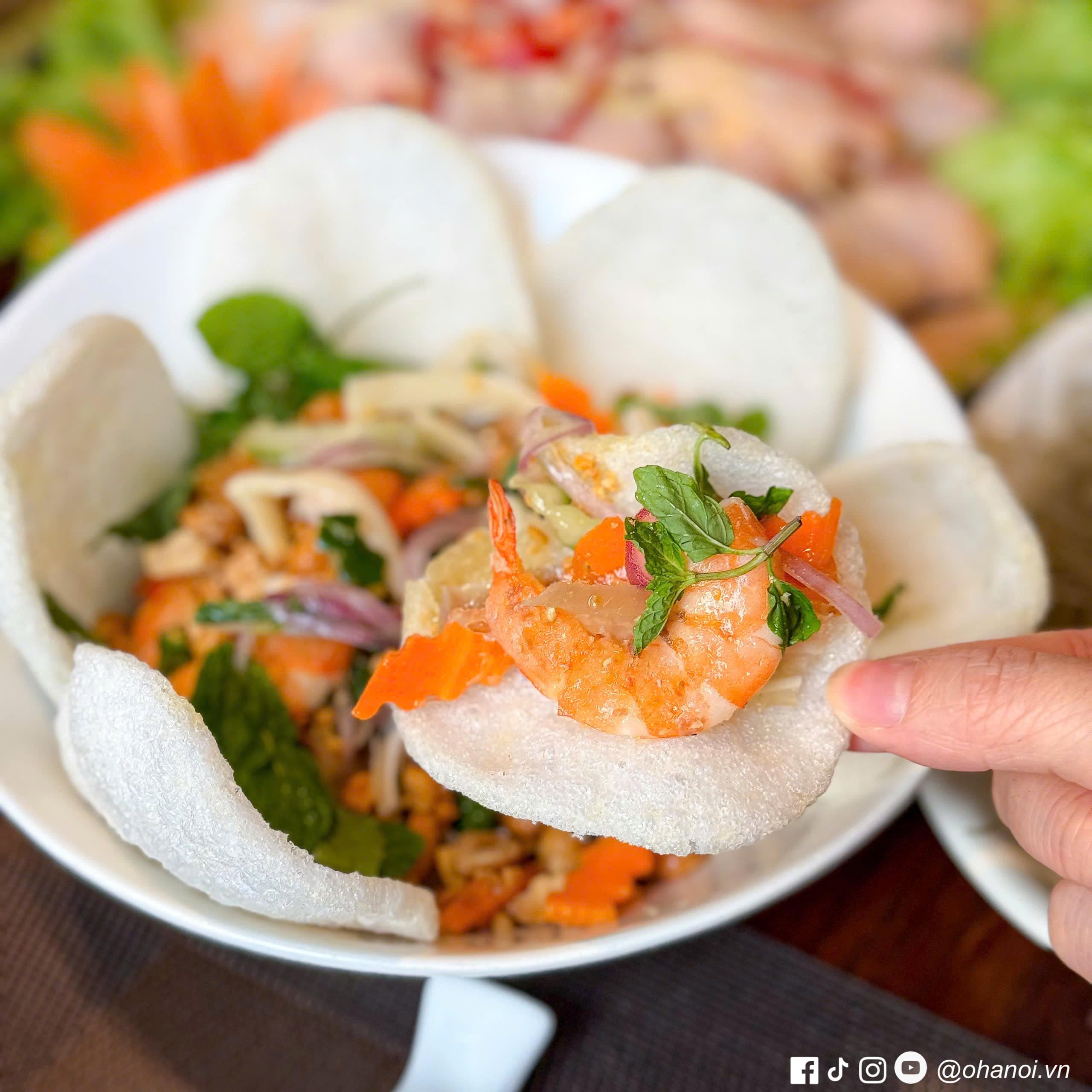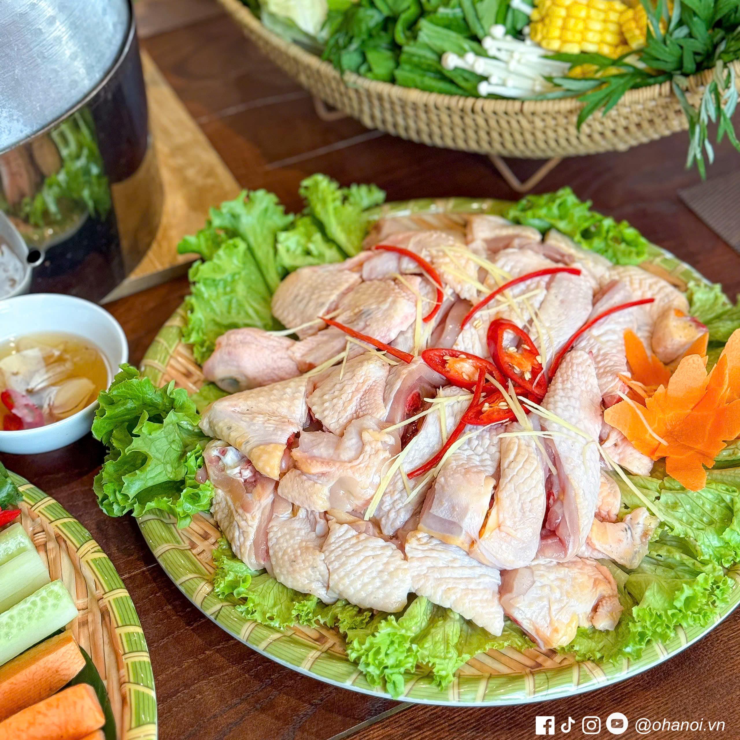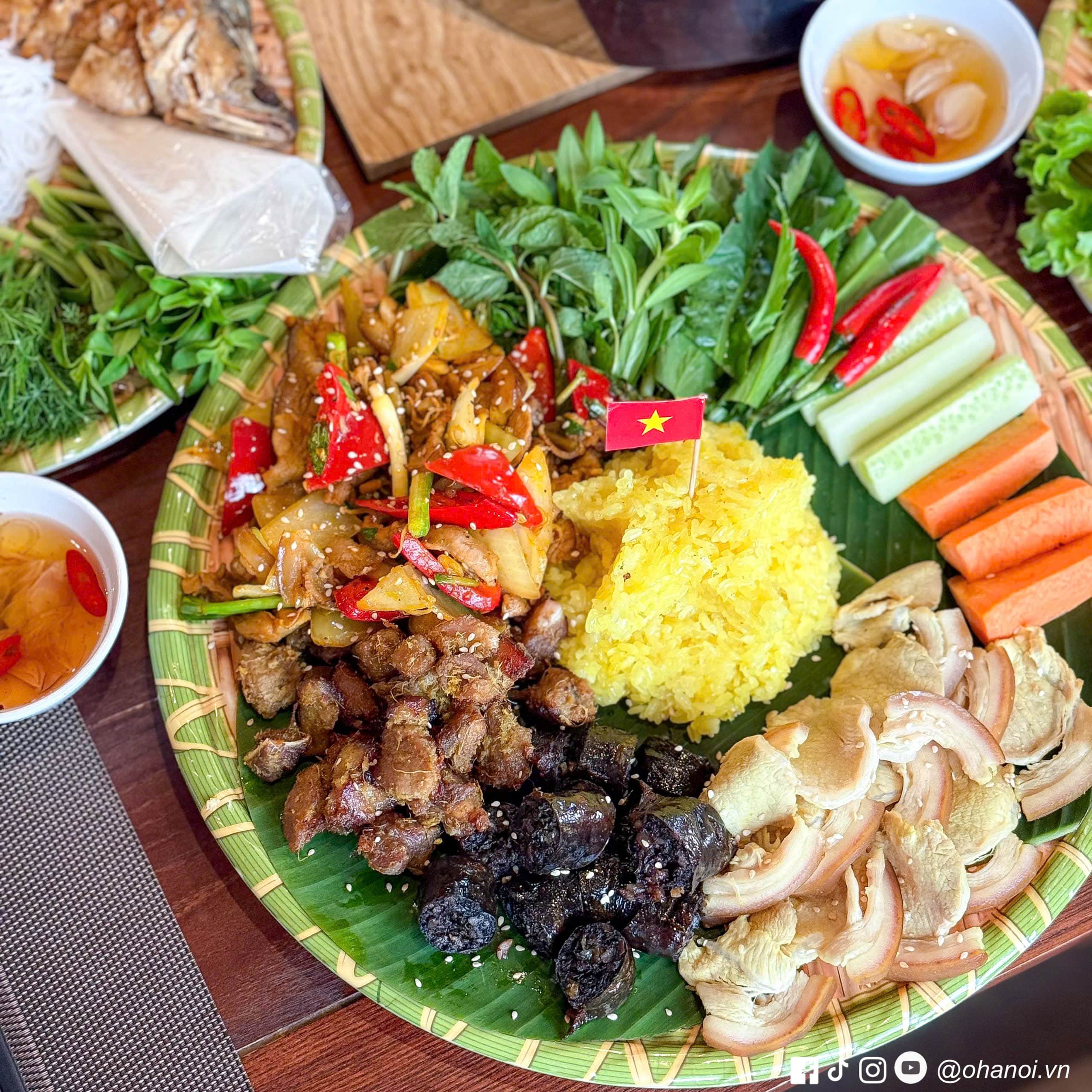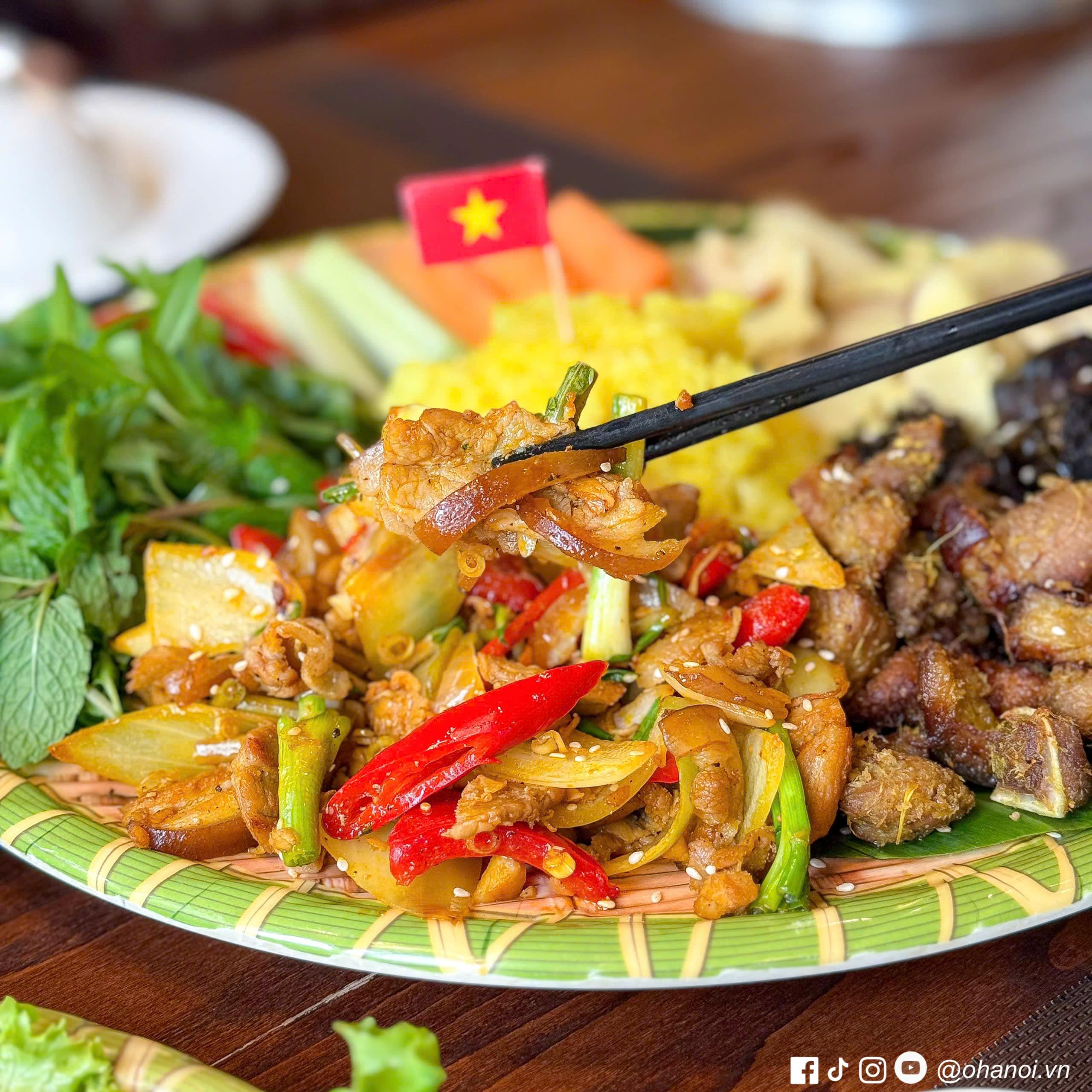 Mình còn ấn tượng với chả cốm gói cánh sen – từng miếng chả vàng ươm nằm trong cánh sen hồng, cắm thêm lá cờ nhỏ xinh, vừa ngon vừa trang trọng. Lẩu gà ri rượu nếp thì thơm lừng, nước dùng ngọt từ xương, xen chút chua dịu của bỗng, ăn kèm rau nấm, miến – mẹ mình khen gà siêu ngon. Mẹt cá thác lác Hoàng Kim cũng đáng thử, nhìn nguyên con cá mà bên trong lại là chả cá, ăn vui miệng lắm.