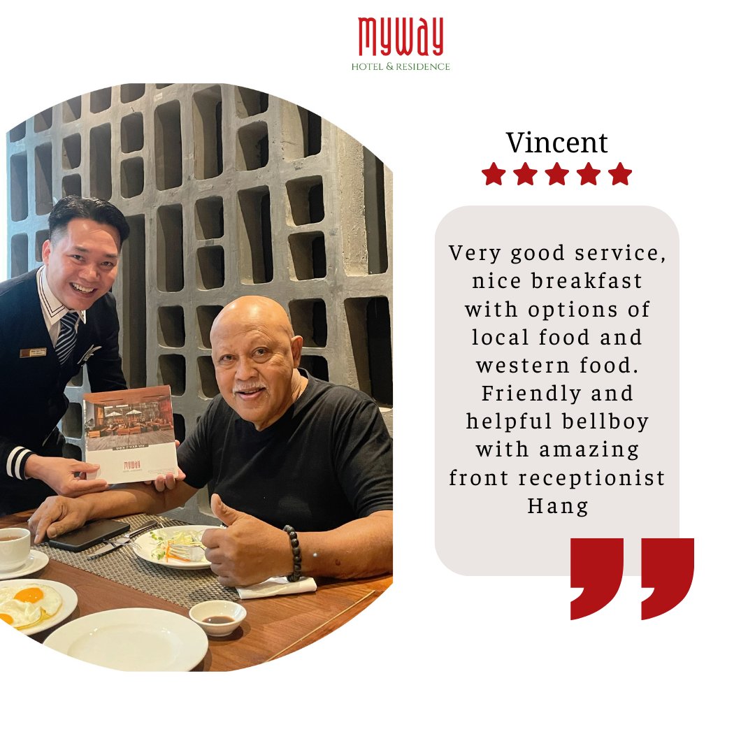 ⭐ Vincent: “Dịch vụ tuyệt vời, bữa sáng phong phú cả món Á lẫn Âu. Đặc biệt ấn tượng với sự nhiệt tình của bellboy và bạn Hằng lễ tân.”