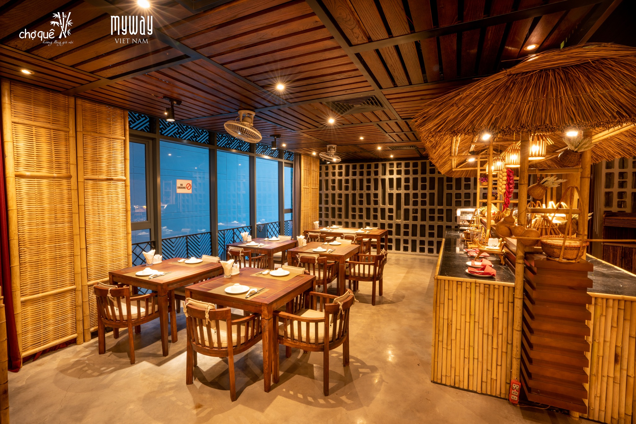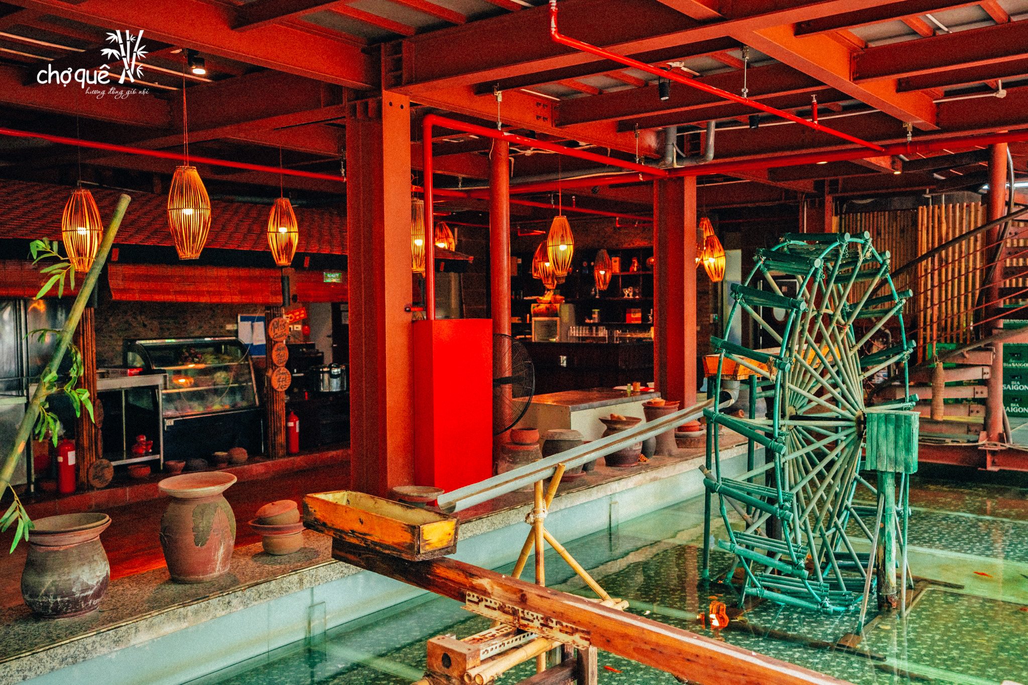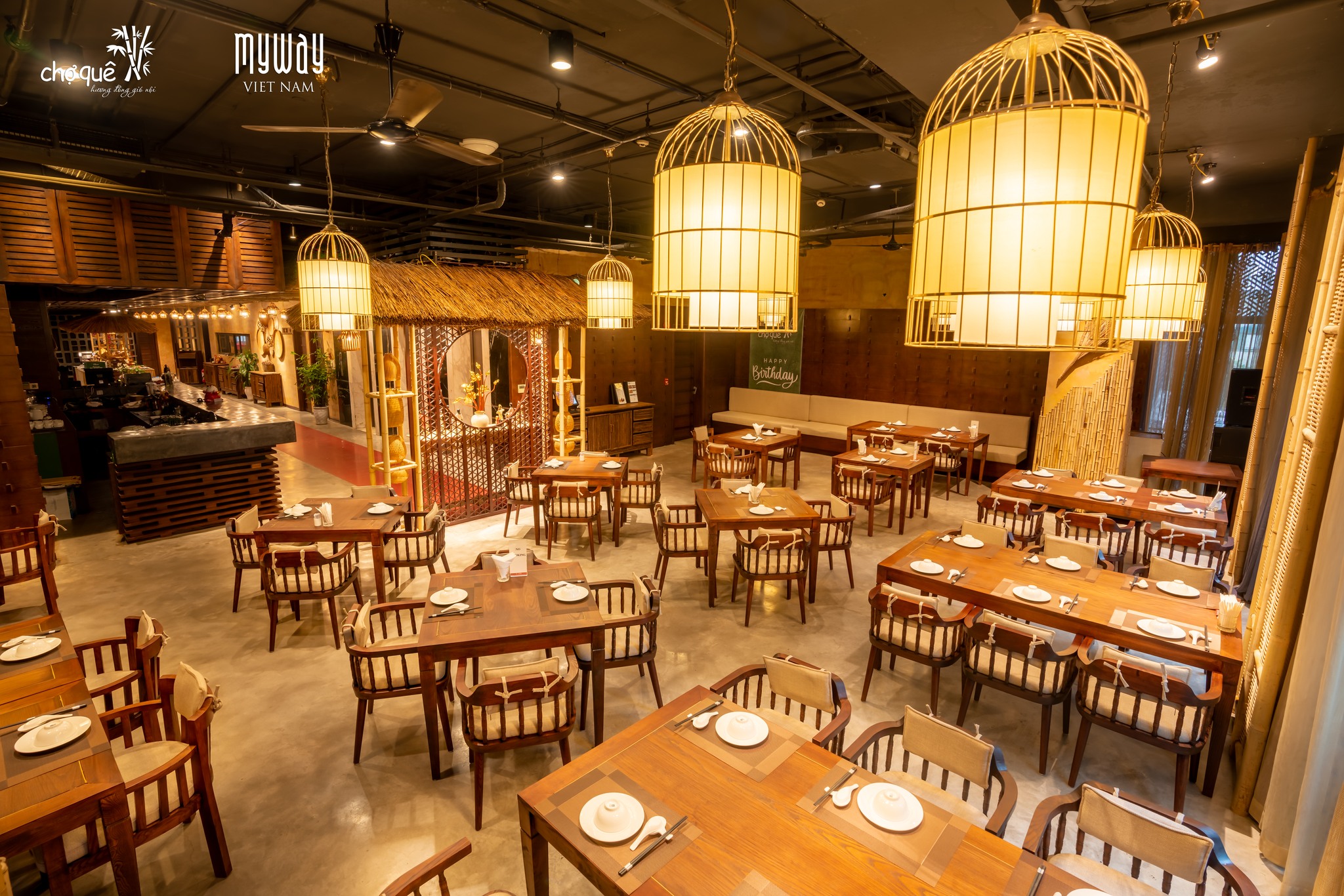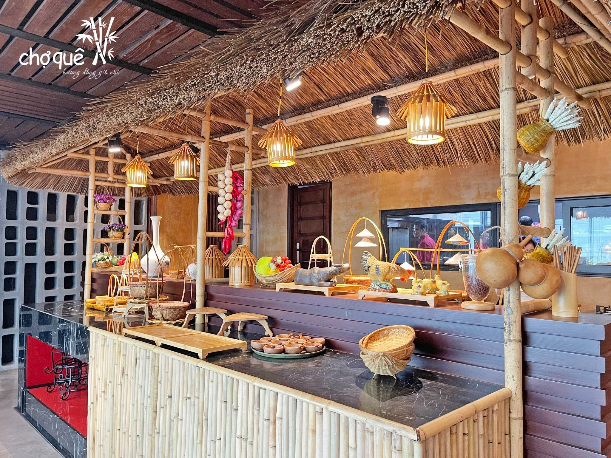 Không gian Chợ Quê mộc mạc với hình ảnh giếng nước, con trâu bên cổng làng, những chiếc nơm, chiếc đó, những bàn gỗ đơn sơ,... như khơi dậy cả một miền ký ức thân thương, lắng đọng. Chợ Quê là thế, không cầu kỳ, xa hoa, chỉ từ những vật dụng đơn giản nhưng lại mang đến sự thân thuộc, ấm cúng với những phòng ăn, không gian khép kín, riêng biệt được các thực khách lựa chọn để tổ chức tiệc liên hoan, hội họp gia đình, bạn bè, công ty... Không chỉ có vậy, bếp tại Chợ Quê còn được kết nối với khu vực bàn cho 2 - 4 người giúp thực khách có thể chứng kiến toàn bộ quá trình, cách thức đầu bếp phục vụ.